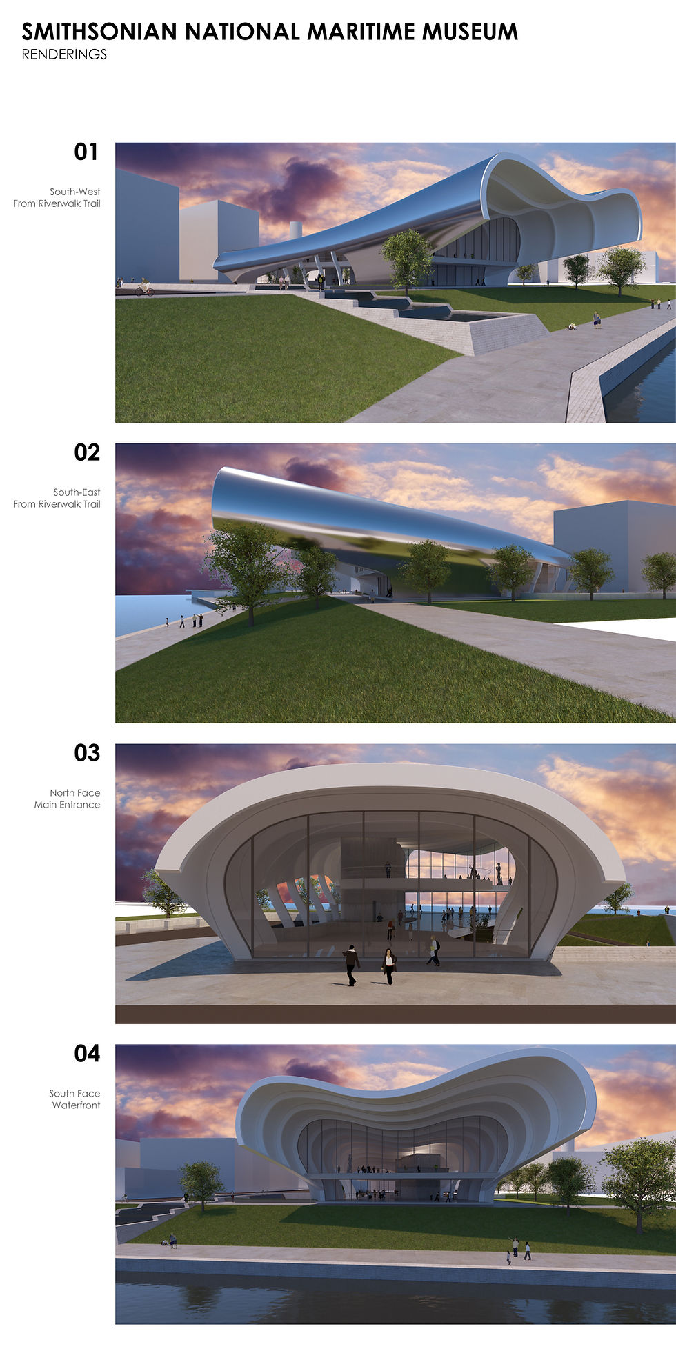 A maritime museum for Washington D.C. inspired by the work of Zaha Hadid. The form is meant to be evocative of an aquatic creature, with the interior utilizing the structural elements of the building to appear as a rib cage. The site is located on the banks of the Anacostia River, and the building responds to the site by framing the best views of a varied landscape and by incorporating large water features which at times blur the line between river and site.